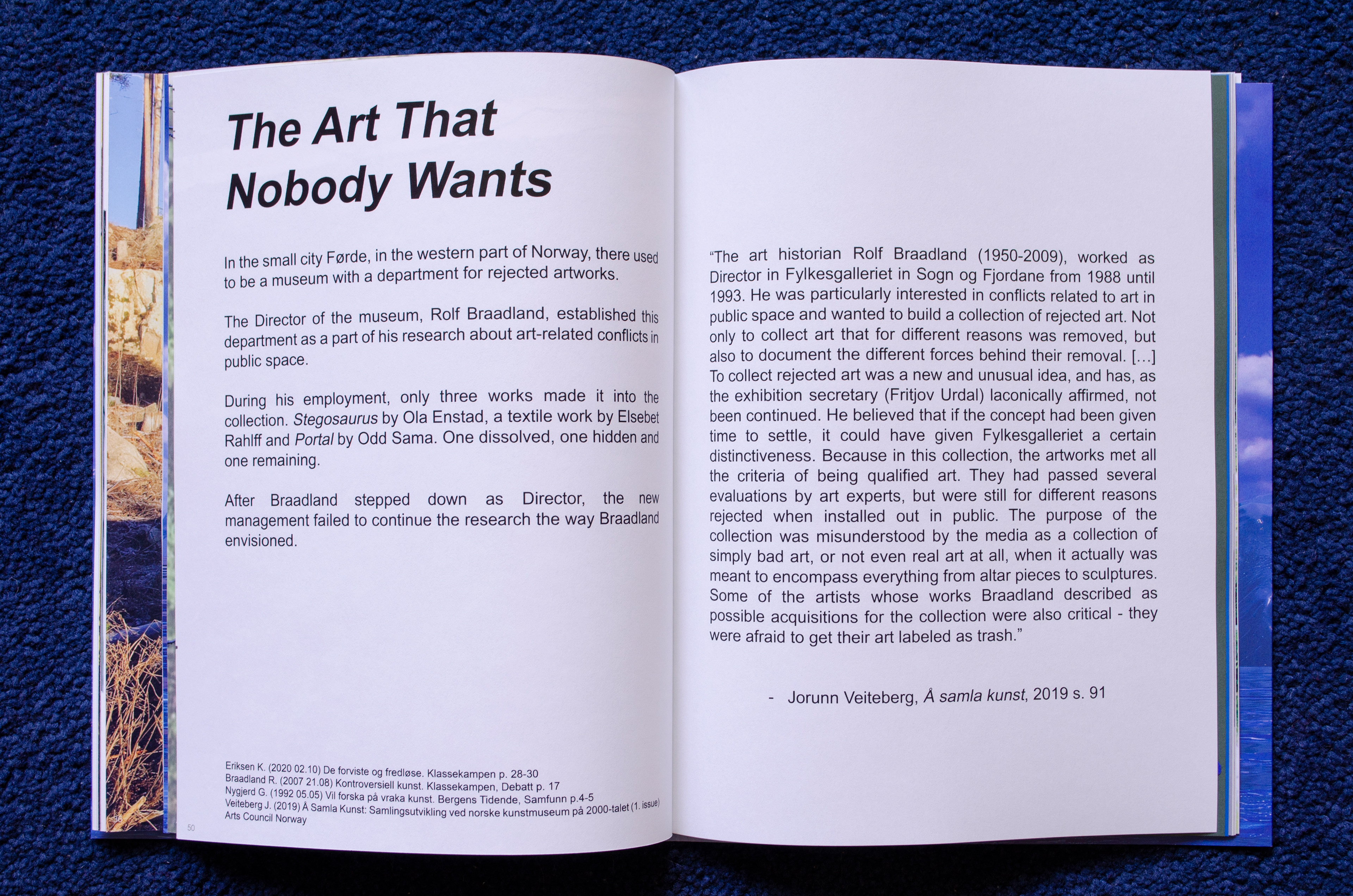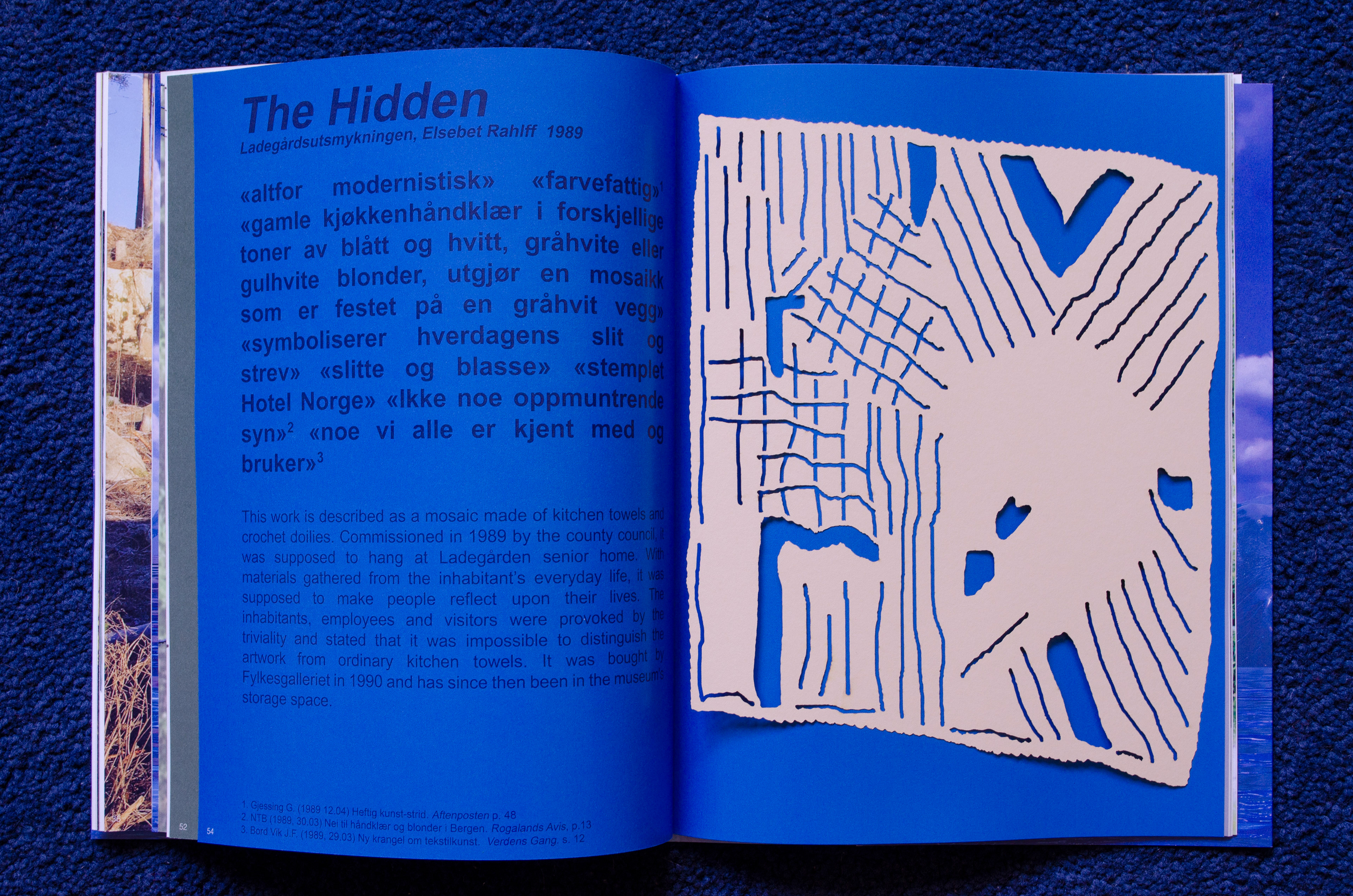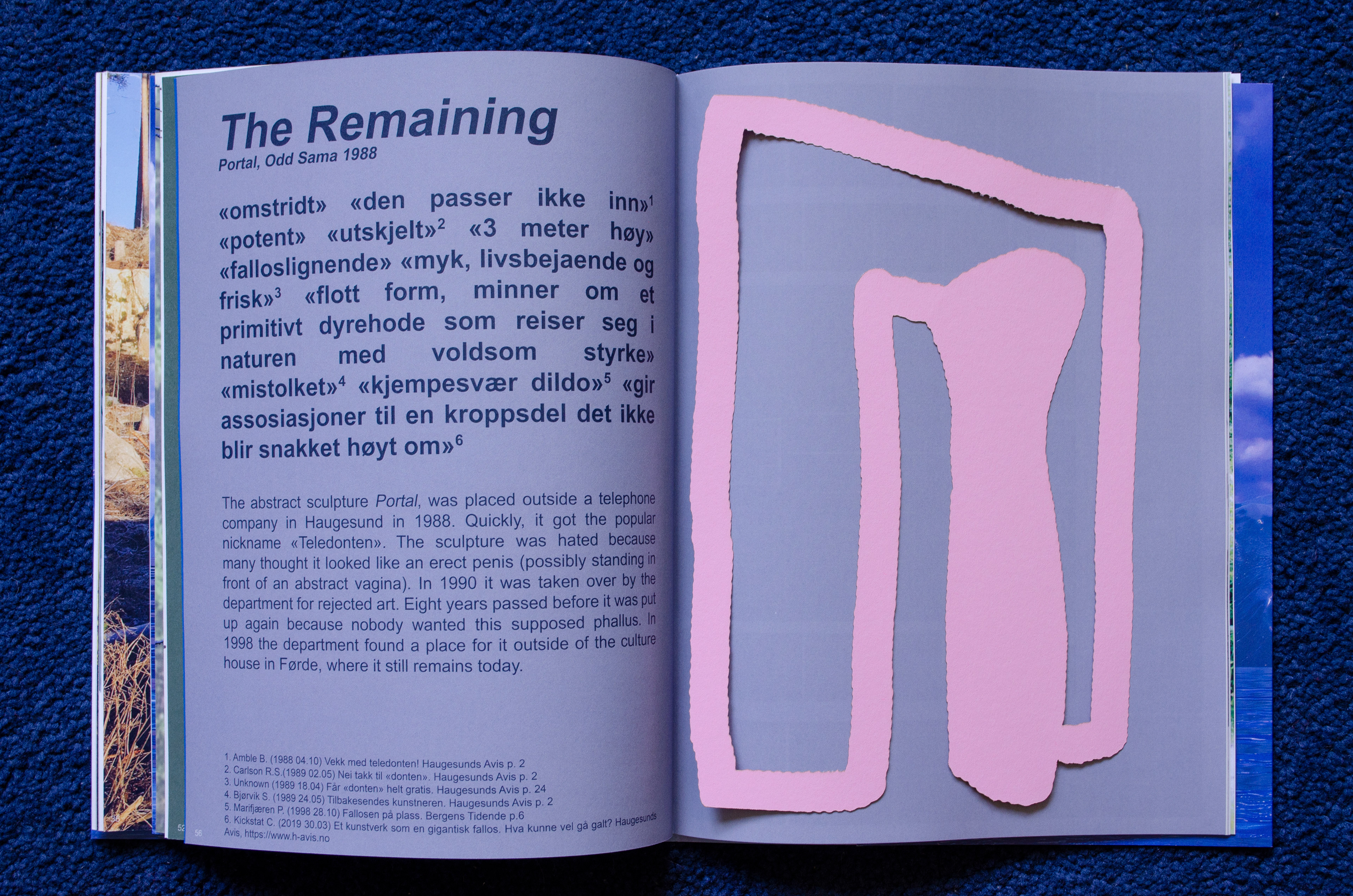 2021 Four spreads printed in 'RE: A dialogue between myself and the landscape' a magazine produced by Mari Mattsson and Laurens Rohlfs A text about the department of rejected public art situated in the west of Norway, Sogn og Fjordane Art Museum. The illustrations are made in laser cut cardboard and lays loose inside the publication.